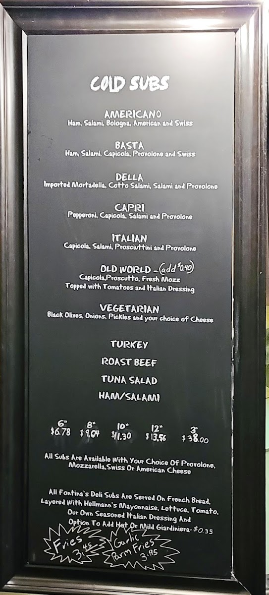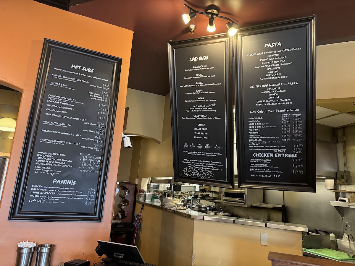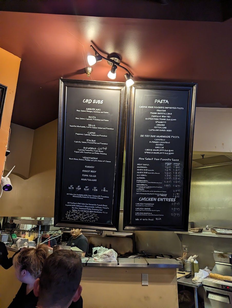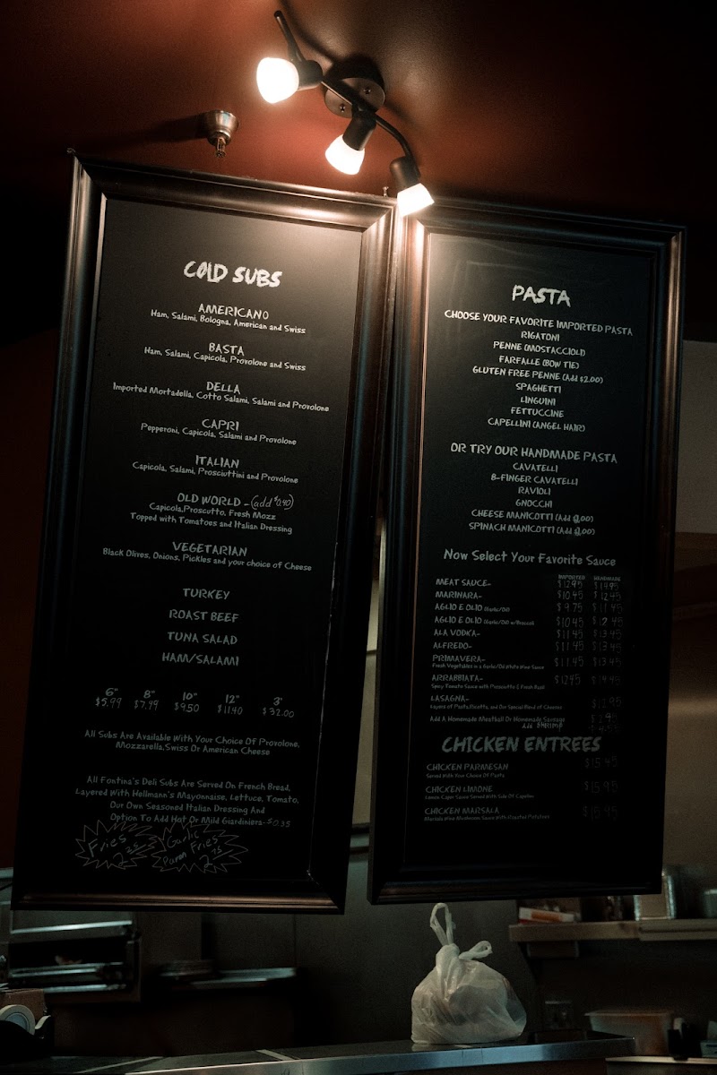 From a reviewer’s perspective, the menu at Fontinas Italian Kitchen feels like a confident summary of classic Italian comfort food done with range and personality. What stands out immediately is the sheer variety, especially the extensive selection of subs, pasta, and traditional entrées, which makes the menu feel both approachable and deeply rooted in Italian-American tradition. The sub offerings alone are impressive, ranging from 6" Italian Beef, 6" Meat Ball, and 6" Combo Beef & Sausage to larger options like 8" Italian Sausage, 8" Italian Beef, 10" Pork Tenderloin, and hearty 12" Italian Beef, 12" Meat Ball, or 12" Combo Beef & Sausage, alongside cold favorites such as Italian 6", Turkey 10", Basta 12", and even party-sized Roast Beef 3'. Pasta lovers are clearly a priority here, with customizable choices like Spaghetti, Penne, Fettuccine, Farfalle (Bowtie), and Gluten Free Penne Pasta, as well as comforting homemade options such as Ravioli, Gnocchi, and 8-Finger Cavatelli. The kitchen’s creativity shows through in specialties like Linguini Shrimp Puttanesca, Penne Arrabbiata Special, Fettuccine Alfredo Con Pollo, Gnocchi Pomodoro, Cheese Lasagna, and 8-Finger Cavatelli Al Funghi, offering depth beyond standard red-sauce fare. Starters and sides, including Fried Calamari, Fontina Bread, Insalata Caprese, Garlic Bread, Shrimp Saute, and Garlic Parmesan Fries, round out the experience nicely, while entrées such as Chicken Alla Parmesan, Veal Parmesan, Chicken Marsala, and seafood dishes like White Fish Picatta give the menu real substance. Even families are well covered with the Kids Menu featuring Pizza Bread, Chicken Fingers W/ Fries, and Grilled Cheese Panini. To finish, classic desserts like Vanilla Gelato, Pistachio Gelato, Oreo Brownie, and Banana Cake provide a satisfying close. Overall, the menu reads like a thoughtful conclusion to everything Fontina’s aims to be: generous, traditional, and versatile enough to satisfy both casual diners and devoted Italian food fans.