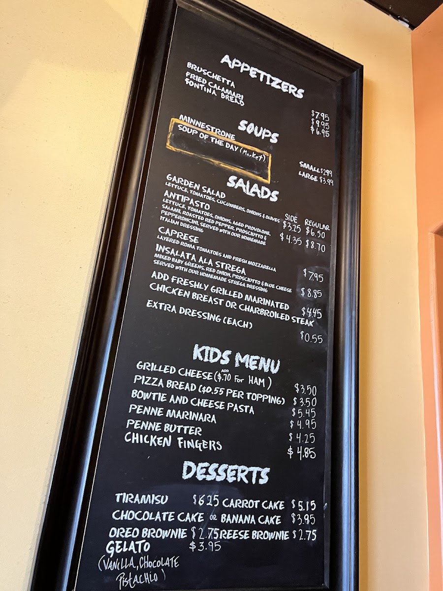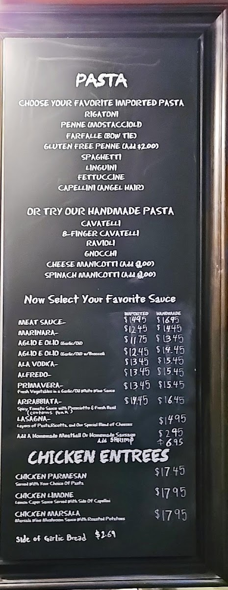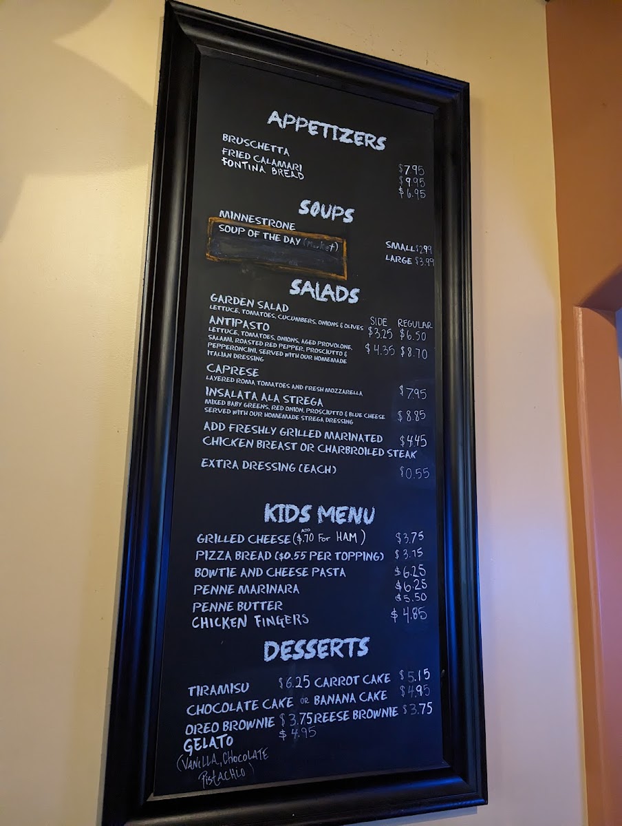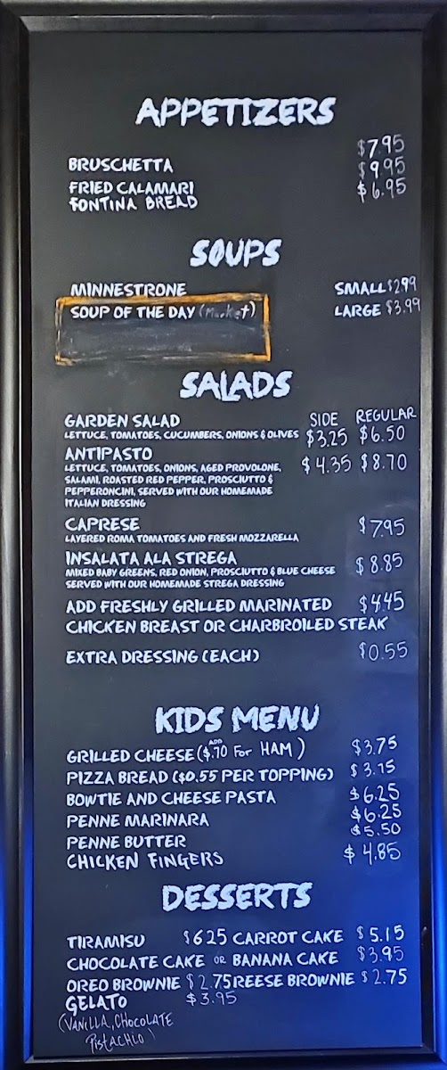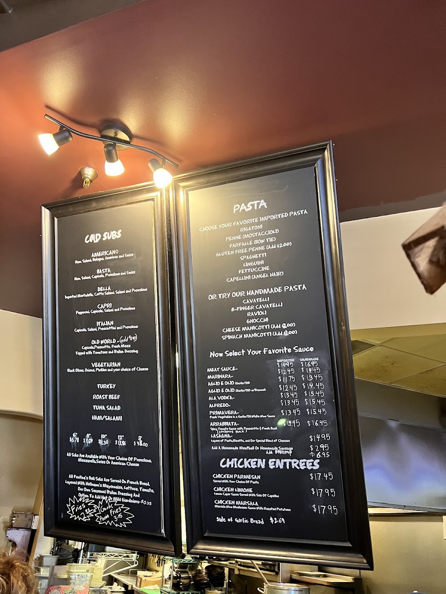 From a reviewer’s perspective, the menu at Fontinas Italian Kitchen feels like a confident summary of classic Italian comfort food done with range and personality. What stands out immediately is the sheer variety, especially the extensive selection of subs, pasta, and traditional entrées, which makes the menu feel both approachable and deeply rooted in Italian-American tradition. The sub offerings alone are impressive, ranging from 6" Italian Beef, 6" Meat Ball, and 6" Combo Beef & Sausage to larger options like 8" Italian Sausage, 8" Italian Beef, 10" Pork Tenderloin, and hearty 12" Italian Beef, 12" Meat Ball, or 12" Combo Beef & Sausage, alongside cold favorites such as Italian 6", Turkey 10", Basta 12", and even party-sized Roast Beef 3'. Pasta lovers are clearly a priority here, with customizable choices like Spaghetti, Penne, Fettuccine, Farfalle (Bowtie), and Gluten Free Penne Pasta, as well as comforting homemade options such as Ravioli, Gnocchi, and 8-Finger Cavatelli. The kitchen’s creativity shows through in specialties like Linguini Shrimp Puttanesca, Penne Arrabbiata Special, Fettuccine Alfredo Con Pollo, Gnocchi Pomodoro, Cheese Lasagna, and 8-Finger Cavatelli Al Funghi, offering depth beyond standard red-sauce fare. Starters and sides, including Fried Calamari, Fontina Bread, Insalata Caprese, Garlic Bread, Shrimp Saute, and Garlic Parmesan Fries, round out the experience nicely, while entrées such as Chicken Alla Parmesan, Veal Parmesan, Chicken Marsala, and seafood dishes like White Fish Picatta give the menu real substance. Even families are well covered with the Kids Menu featuring Pizza Bread, Chicken Fingers W/ Fries, and Grilled Cheese Panini. To finish, classic desserts like Vanilla Gelato, Pistachio Gelato, Oreo Brownie, and Banana Cake provide a satisfying close. Overall, the menu reads like a thoughtful conclusion to everything Fontina’s aims to be: generous, traditional, and versatile enough to satisfy both casual diners and devoted Italian food fans.